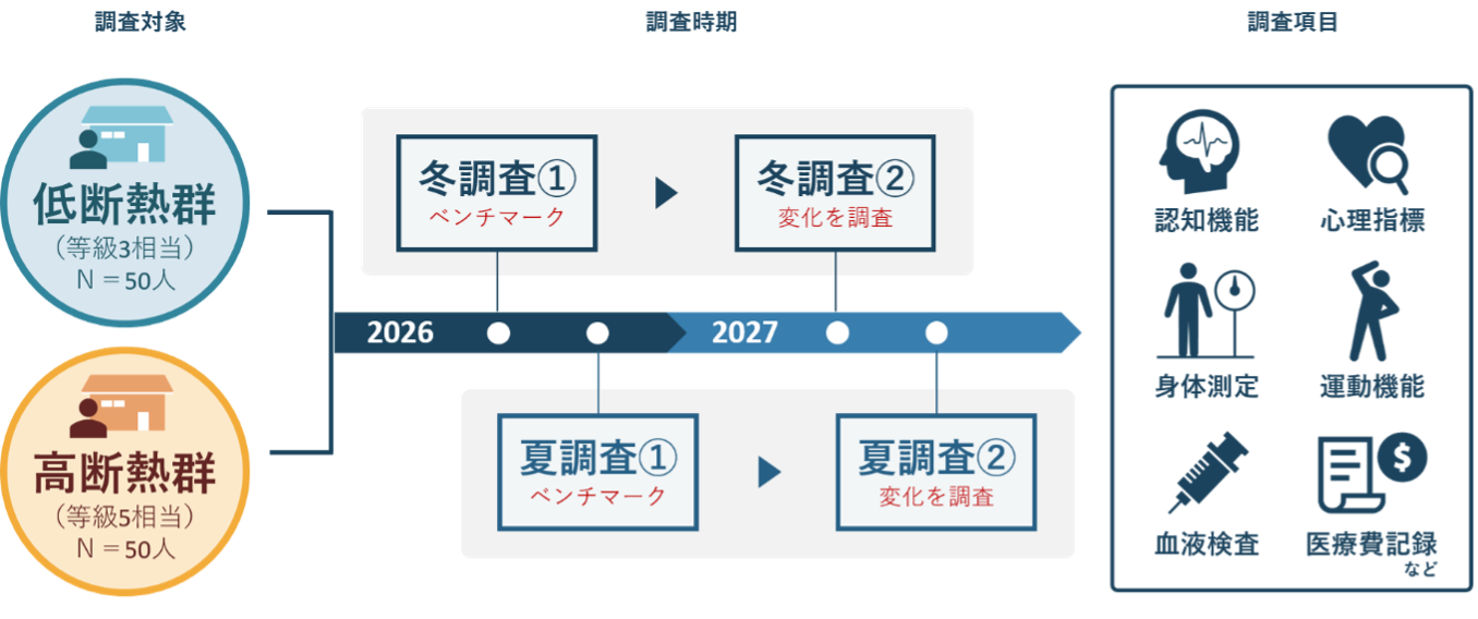 本調査では、宮城県内の居住者を対象とします。戸建の住居を中心に断熱性能を低断熱群(断熱等性能等級3相当)と高断熱群(同等級5相当)の2群に分け、断熱性能効果を前向きコーホート*2研究にて検証を行います。それぞれ冬季、夏季の1年経過後の差を分析・解析します。