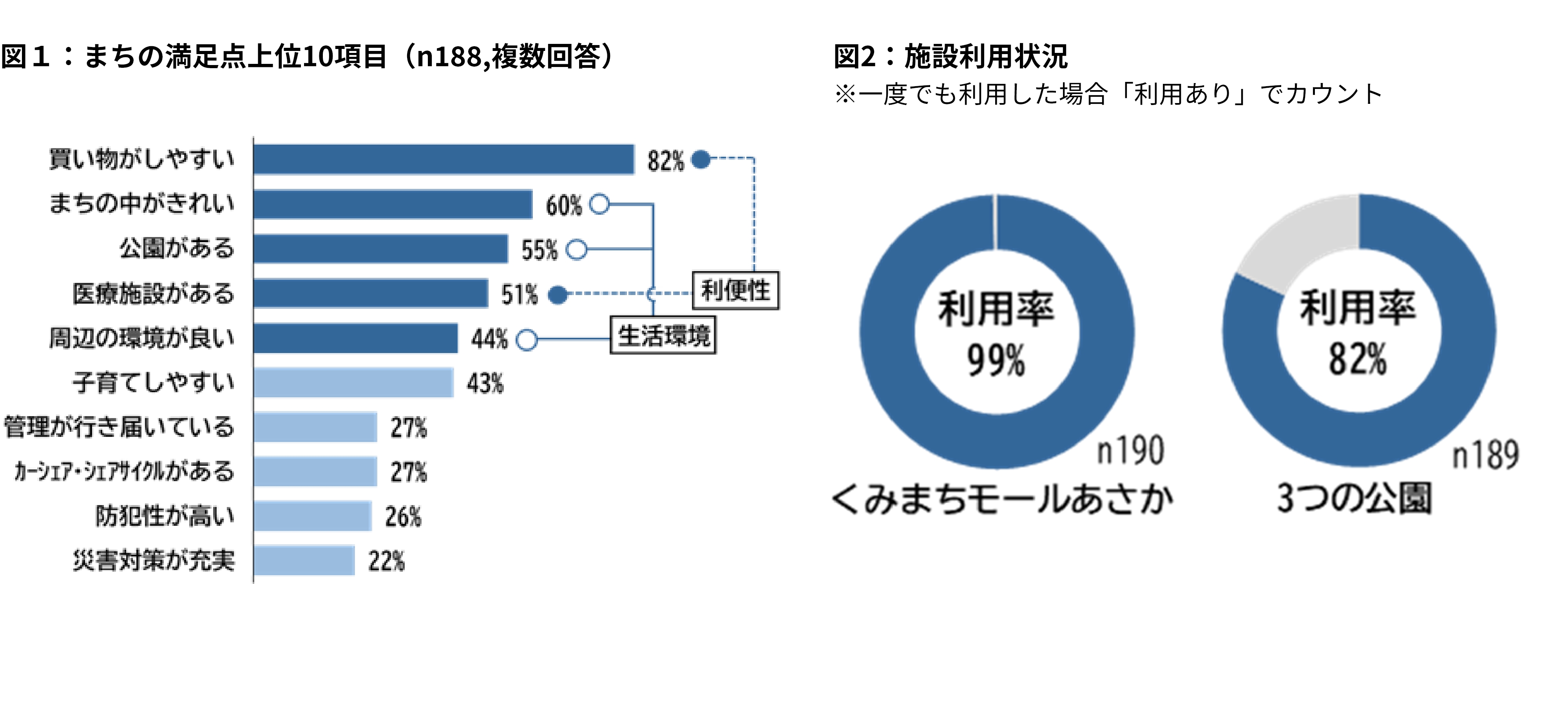 「まちで満足している点は?」という質問に対し、15項目から複数回答をしてもらった結果、1位「買い物がしやすい」、2位「まちの中がきれい」、3位「公園がある」、4位「医療施設がある」、5位「周辺の環境が良い」でした。これをカテゴリーで分けると、1位と4位は利用率がほぼ100%のくみまちモールあさかの「利便性」、2位、3位、5位は行き届いた清掃や、利用率82%の3つの公園の「生活環境」という2つに集中していました。1位から4位までの項目は、言い換えるとランドスケープデザインと管理システムになります。