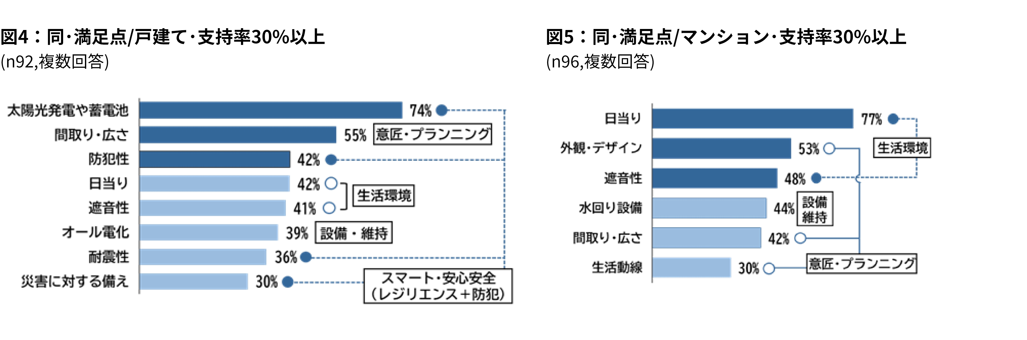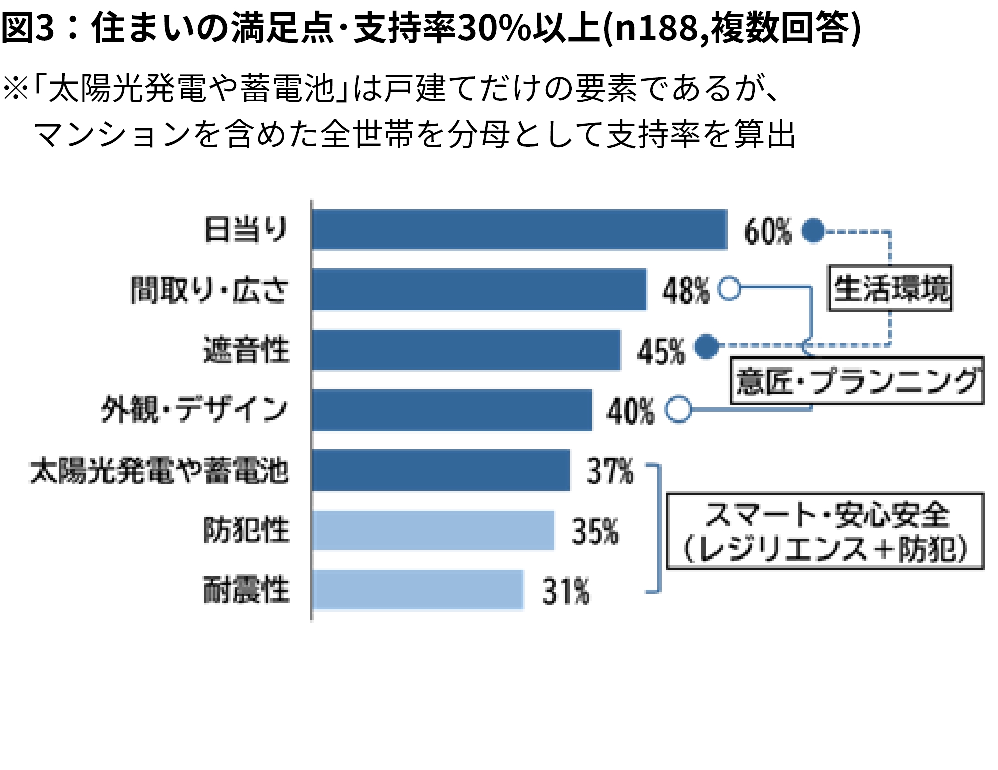 「住まいで満足している点は?」という質問に対し、19項目から複数回答をしてもらった結果、1位「日当り」、2位「間取り・広さ」、3位「遮音性」、4位「外観・デザイン」、5位「太陽光発電や蓄電池」でした。これらをカテゴリーで分けると、1位と3位は「生活環境」、2位と4位は「意匠・プランニング」、5位は「スマート・安心安全(レジリエンス+防犯)」となります。