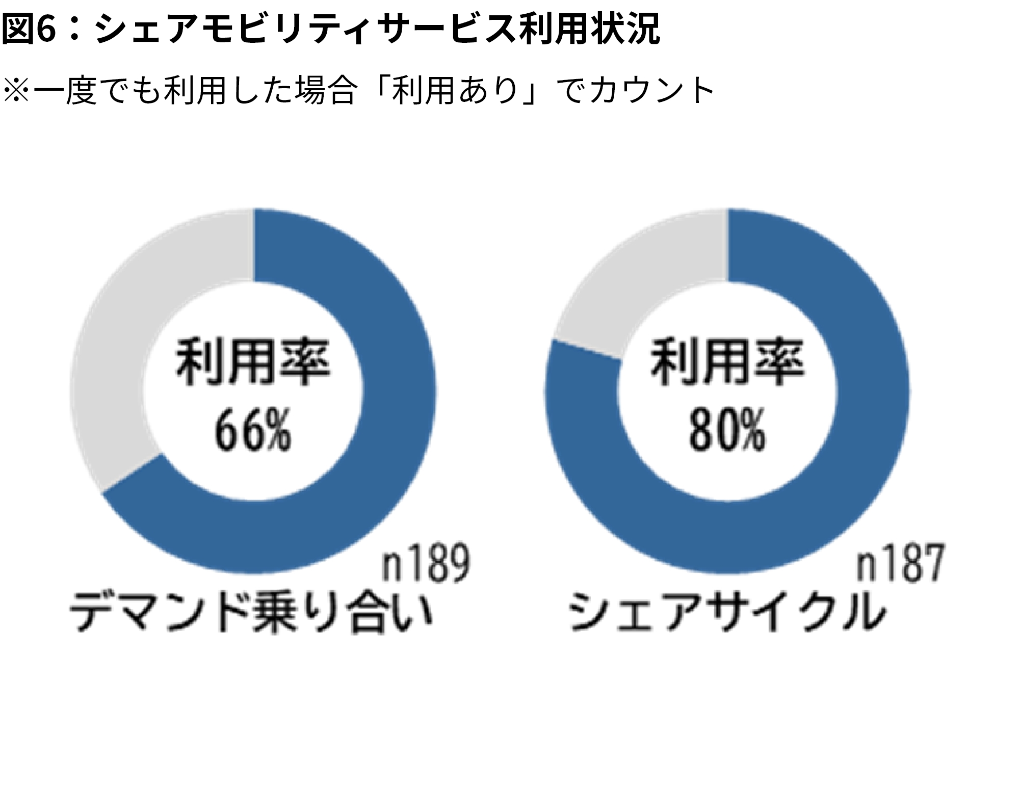 タウン内のシェアモビリティサービスの利用状況は、3か所に設置しているシェアサイクルが80%、24時間乗車予約が可能なデマンド乗り合いサービスが66%で、いずれもその機能性を発揮していました。デマンド乗り合いサービスについては、住民から行き先の複数化や営業日を増やす要望もあり、そのことからも存在の重要性が伺えました。