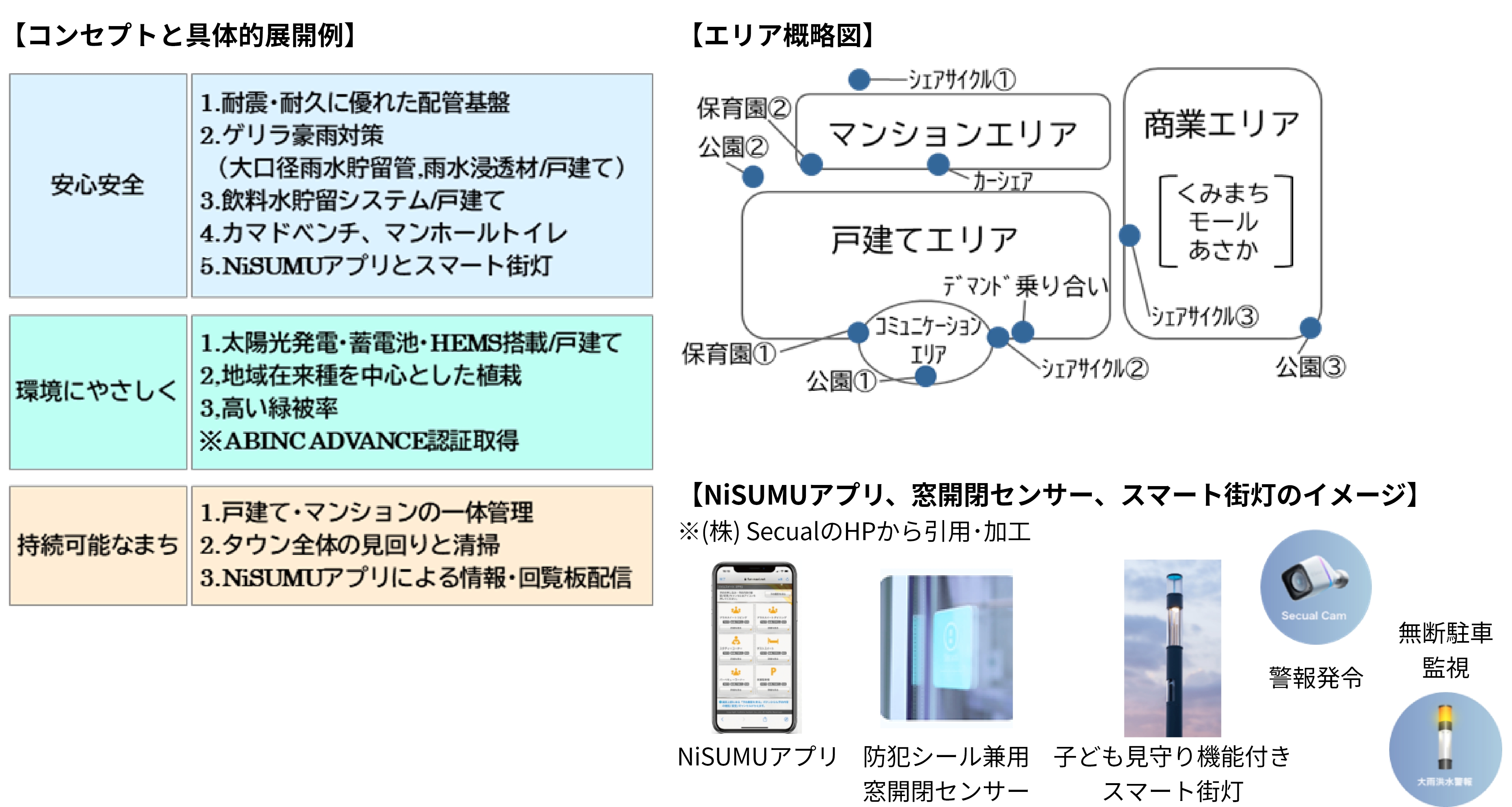 『あさかリードタウン』(以下タウン)は、「安心・安全で、環境にやさしく、持続可能なまち」をコンセプトとして、全130戸の戸建て住宅、全212邸の分譲マンション、くみまちモールあさか(スーパーマーケット、ホームセンター、複数のクリニック、薬局、フードコートなど)、3つの公園、2つの保育園などから構成されており、完成から5年余りが経過しました。