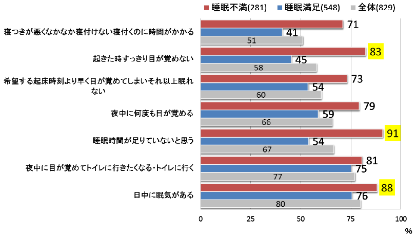 具体的にはどういった点で睡眠に不満を感じているか調査したところ、全体では80%が「日中に眠気がある」、77%が「夜中に目が覚めてトイレに行く」、67%が「睡眠時間が足りていない」、66%が「夜中に何度も目が覚める」、60%が「起床時刻より早く目が覚める」と回答しました。不満層では91%が「睡眠時間が足りない」、88%が「日中に眠気がある」、83%が「起きた時すっきりしない目が覚めない」と睡眠不足に関する悩みを抱えている人が多いことが明らかになりました。