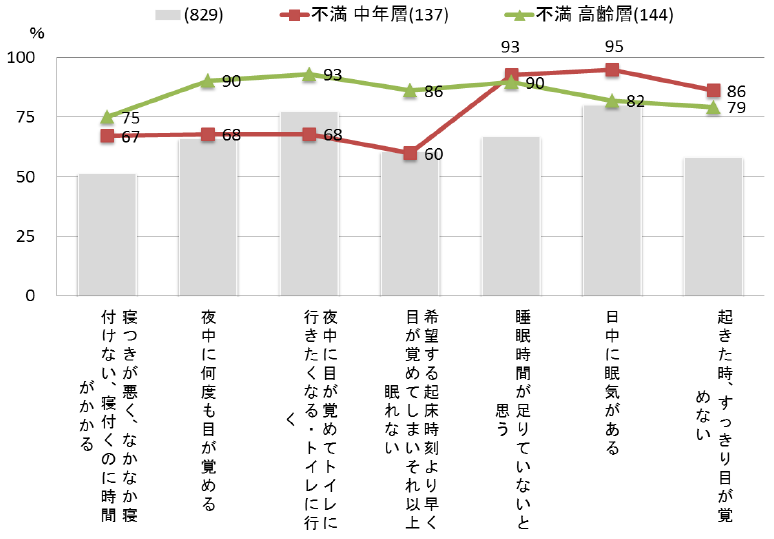 中年の不満層では95%が「日中の眠気」、93%が「睡眠時間が足りない」、86%が「起きた時すっきりしない」と感じており、睡眠に関する不満を抱えていることがわかりました。