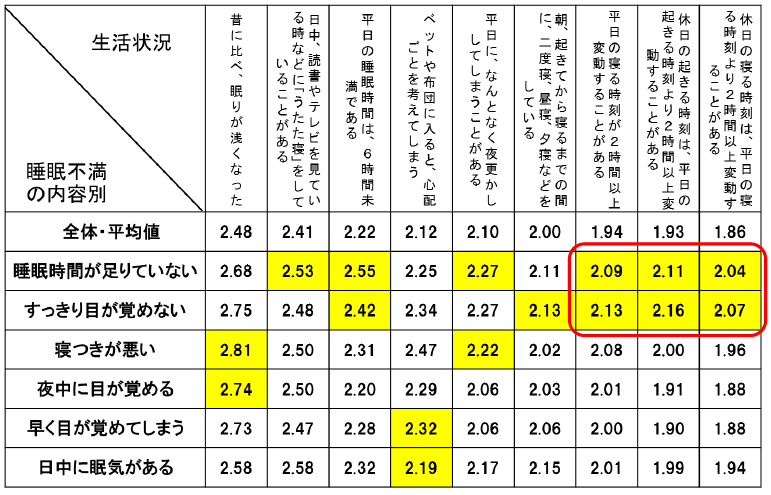 睡眠不満の内容別に生活状況を見ると、「睡眠時間が足りない」人は「朝、起きてから寝るまでの間に、二度寝、昼寝、夕寝などをしている」、「平日の睡眠時間は、6時間未満である」、「休日の起きる時刻は、平日の起きる時刻より2時間以上変動することがある」「休日の寝る時刻は、平日の寝る時刻より2時間以上変動することがある」において平均のポイントが高いことが分かります。「すっきり目が覚めない人」でも、「休日の起きる時刻・寝る時刻は、平日の起きる時刻・寝る時刻より2時間以上変動することがある」においてポイントが高く、日常生活の不規則性が睡眠不満の原因として考えられます。