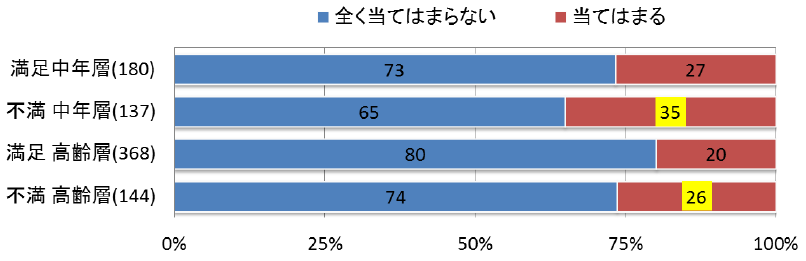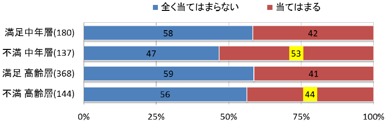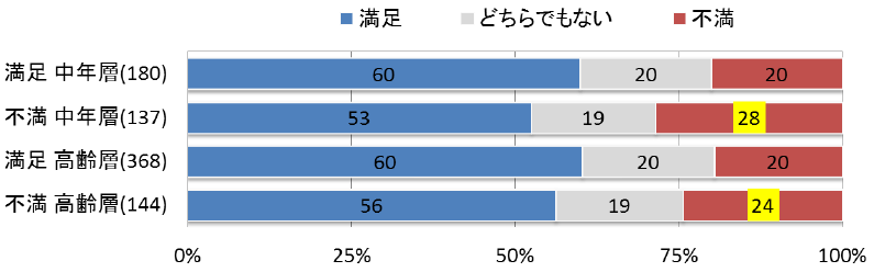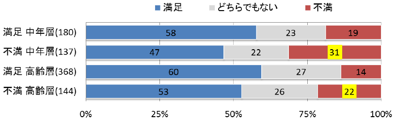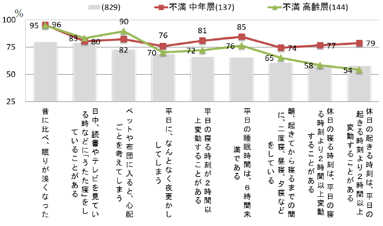 年齢別の睡眠満足度では、中年の不満層で「平日の睡眠時間が6時間未満」、「平日の起床」、「休日の起床時刻の変動」、「休日の就床時刻の変動」、「平日夜更かし」において、高齢層よりもポイントが高くなっています。中年層で生活の規則性が乱れていることが伺えます。