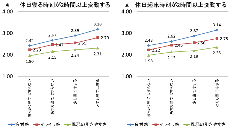 睡眠不満の原因と考えられる「平日寝る時刻が2時間以上変動する」、「平日起床時刻が2時間以上変動する」人は、どちらの場合でもこれらの事が「まったく当てはならない」人に比べ「とても当てはまる」人の方が「疲労感」、「イライラ感」、「風邪の引きやすさ」をより強く感じている事が分かります。また、平日だけではなく休日の就床・起床時刻の変動においても同様の傾向が見られました。これらから生活の規則性が乱れると身体の不調につながることが確認されました。