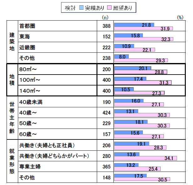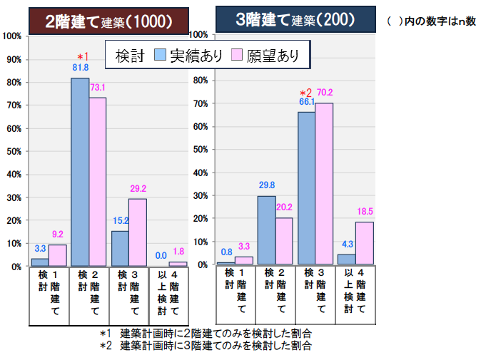図2 属性別、3階建て検討の「実績」と「願望」※2階建て建築者で集計