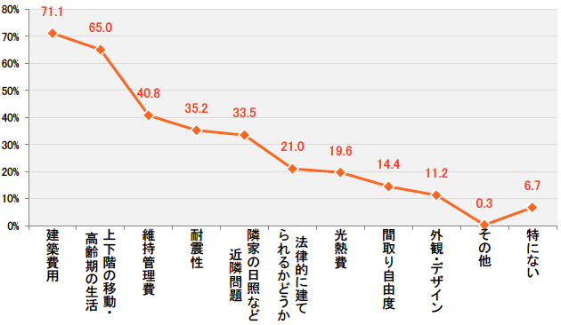 2階建て居住者に「3階建て住宅で不安に思うこと」を複数回答で聞いたところ、「建築費用」(71.1%)、「上下階の移動・高齢期の生活」(65.0%)が、50%を超えるツートップとなりました。