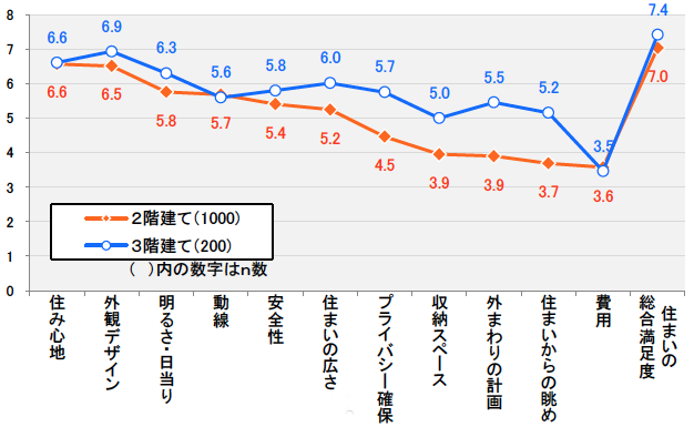 満足度の差が大きいのは、「プライバシー確保」が2階建て居住者4.5に対し3階建て居住者5.7、「収納スペース」は3.9に対し5.0、「外まわりの計画」は3.9に対し5.5、「住まいからの眺め」3.7に対し5.2となっています。