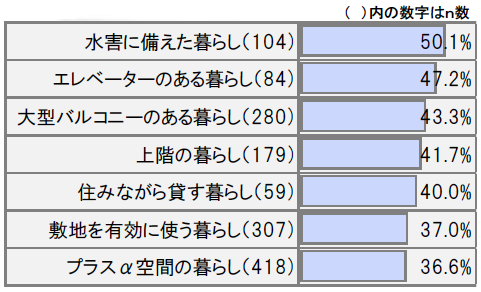 3階建て願望(2階建て建築者)を実現したい暮らし別に見ると、1位が「水害に備えた暮らし」(50.1%)で、次いで「エレベーターのある暮らし」(47.2%)、「大型バルコニーのある暮らし」(43.3%)と続きます。住ニーズは社会・経済動向を敏感に反映するといわれていますが、今回の「実現したい暮らしニーズ」調査でもそのことがはっきりと浮き彫りにされたのが「水害への備え」ニーズです。最近、集中豪雨による洪水、河川の氾濫による、甚大な被害が発生していますが、そうした水害被害の増加が「水害の備え」ニーズ、引いては3階建て願望の高まりに反映されているといえます。