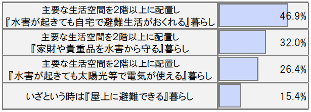また、「3階建てで実現したい水害の備え」として、主要な生活空間を2階以上に配置し、「水害が起きても自宅で避難生活が送れる暮らし」(46.9%)、「家財や貴重品を水害から守る暮らし」(32.0%)、「水害が起きても太陽光等で電気が使える暮らし」(26.4%)、「いざという時は屋上に避難できる暮らし」(15.4%)などがあがっていました。