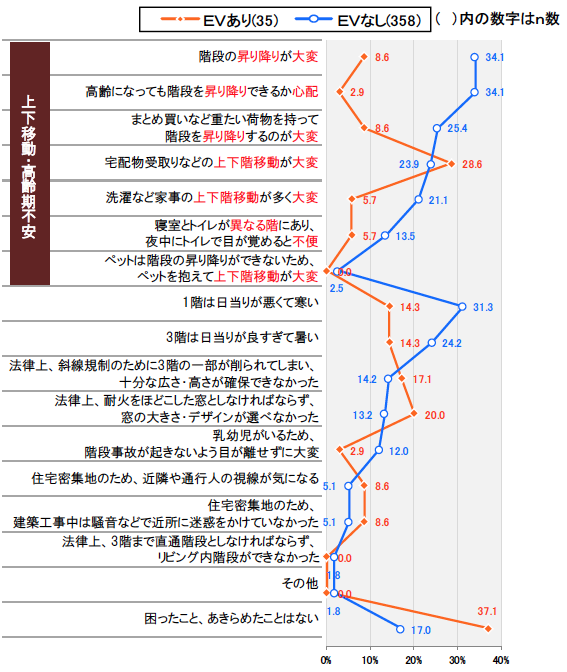 昨年度調査より、3階建ての困りごと「上下移動・高齢期不安」は、エレベータの採用で概ね解消されており、またエレベータ採用層の88.6%が「採用して良かったと回答」しており、3階建ての満足度向上はエレベータの採用とその使い勝手の良さがあげられます。