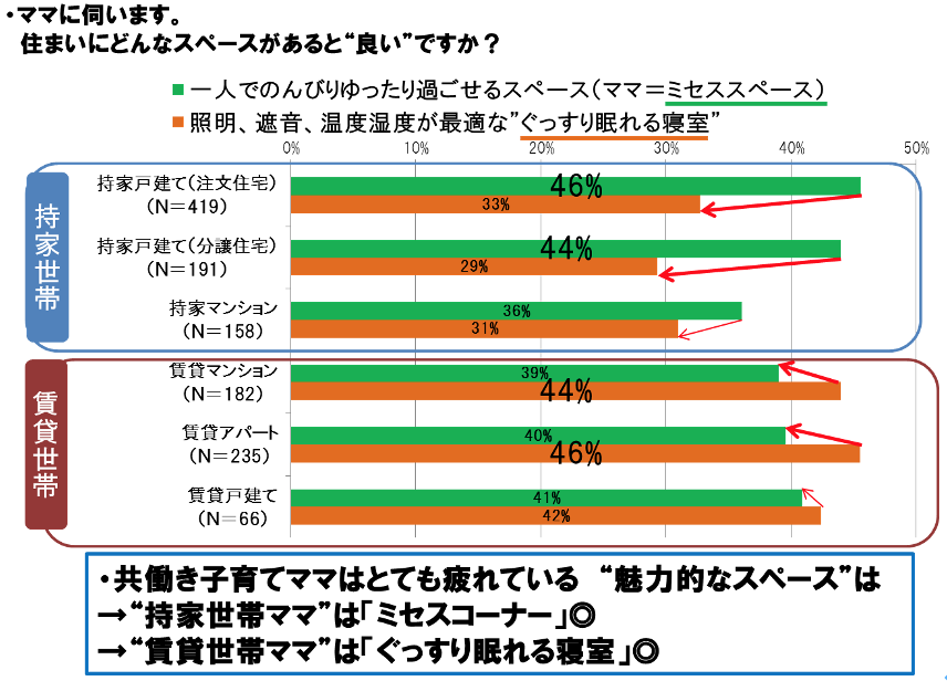 「住まいにどんなスペースがあるといいか」について聞いたところ、持家と賃貸では大きな違いがありました。現在、持家(注文住宅)に住んでいるママでは、一人でゆっくりと過ごすことができる「ミセススペース」(46%)が最多で、これは分譲住宅の持家でも44%を占めていました。一方、賃貸住宅(アパート)にお住まいのママは「ぐっすり眠れる寝室」(46%)が最多で、これはマンションと一戸建ての賃貸住宅で同様の傾向でした。持家、賃貸のどちらの居住形態でも、共働き子育てママは、仕事と家事を両立させているため、お疲れ気味であり、「一人でのんびりゆったりとできるスペース」「快眠寝室」を求めていることが指摘できそうです。
