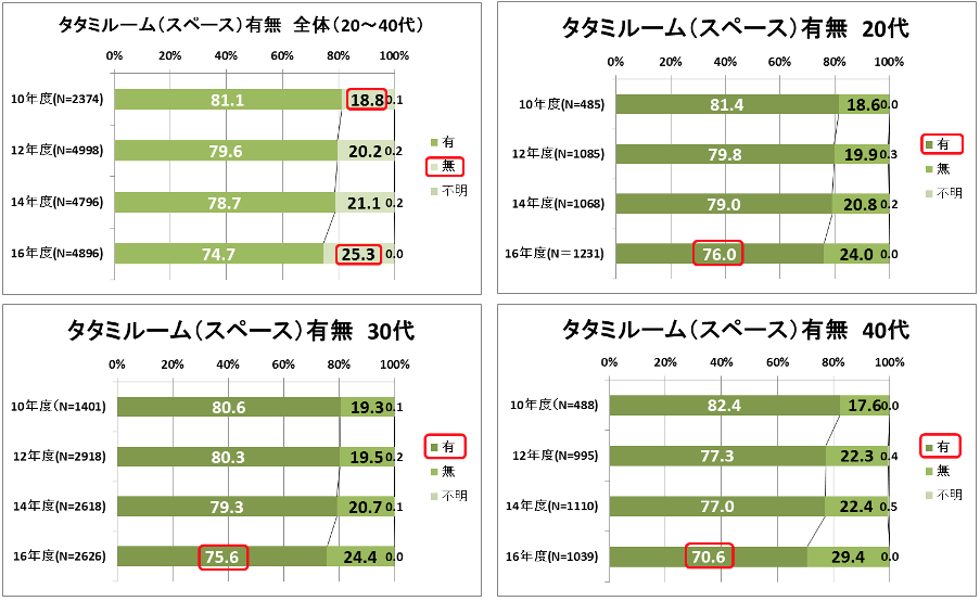 タタミルーム(タタミスペース含む)の有無については、16年度全体で「無し」が25.3%(10年度18.8%)に増加していました。一方で年代別でみると、20代で「有り」が76.0%と、30代で75.2%、40代で70.6%となっており、若い世代ほど採用に積極的であることがわかりました。