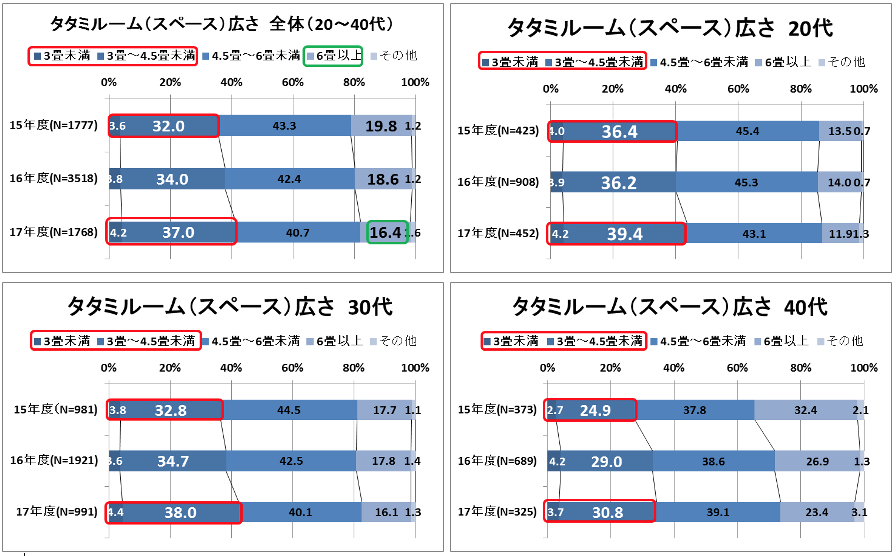 タタミルーム(タタミスペース含む)の広さについては、17年度全体は4.5畳未満が41.2%(10年度35.6%)と年々縮小していました。年代別では、20代が43.6%(同40.4%)、30代が42.4%(同36.6%)、40代が34.5%(同27.6%)と、4.5畳未満がいずれも増加していました。17年度全体では6畳以上のタタミルームの比率は16.4%の少数派となりました。これらのことから、タタミルームの用途において、「客間」が減少し、4.5畳未満でも「子育て」「家事」「趣味」など自由に使える“場”としてのニーズはあり、特に“小さな子どもの場”(昼寝・遊びなど)として20代、30代での採用率が高いと考えられます。