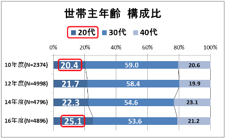 世帯主年齢の構成比では40代が20%前後の推移で大きく変わらない一方、20代の割合が10年度の20.4%から16年度では25.1%と増加していました。