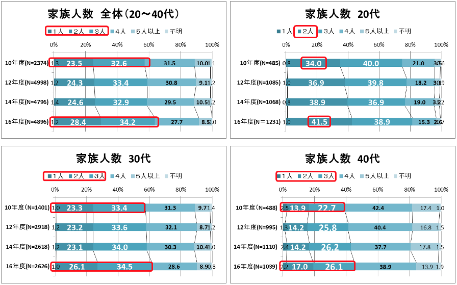 家族構成については、16年度全体で3人以下が63.8%(10年度57.4%)となり、いずれの年代においても増加しています。特に20代では16年度に2人世帯の割合が41.5%(10年度34.0%)になり、増加していました。
