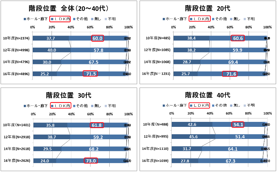 階段の位置は、「LDK内」が16年度全体で71.5%(10年度60.0%)と、「ホール・廊下」と比べて圧倒的な多さでした。年代別では、20代が71.6%(同60.6%)、30代が73.0%(同61.8%)、40代が67.3%(同54.1%)と、いずれの年代でも増加していました。