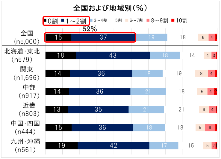 地震被害に遭う確率は「2割以下」と回答した人が52%と半数を占め、地震被害への意識が低いことが判明。居住地域によっても地震への警戒感に差があることがわかりました。