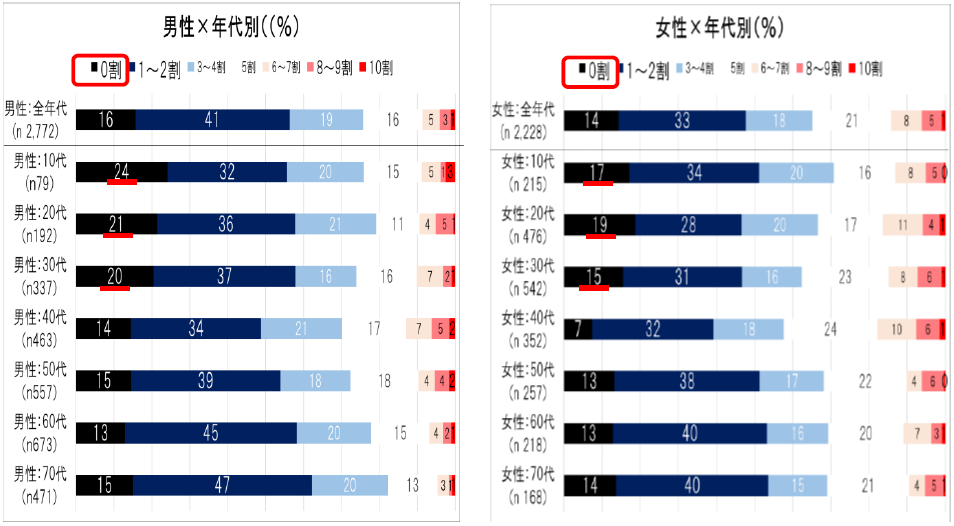 地震被害に遭う確率は「0割」と回答した人は男性10~30代では20%を超え、女性10~30代では15~19%と、40~70代よりも多いことがわかりました。