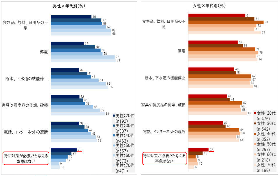 年代別の傾向では、男性は、各項目とも年齢が下がるほど必要性を感じる人が少なくなり、女性では40代~70代が平均的に意識の高い人が多く、20~30代と比べると顕著な差が見られました。また「特に対策が必要と考える事象はない」という回答は男性20代:29%、女性20代:22%という結果となりました。