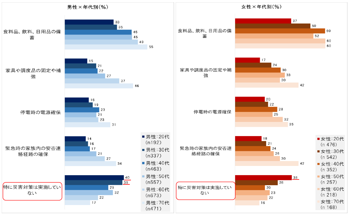 年代別では、年齢が下がるほど対策実施率が低くなる傾向が見られ、若年層(20~30代)では備蓄以外の項目における対策実施率が30%を下回り、「特に災害対策は実施していない」という回答では男性20代:40%、男性30代:39%。女性20代:38%という結果となりました。