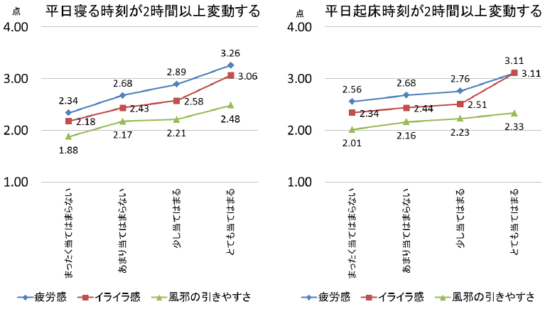 睡眠不満の原因と考えられる「平日寝る時刻が2時間以上変動する」、「平日起床時刻が2時間以上変動する」人は、どちらの場合でもこれらの事が「まったく当てはならない」人に比べ「とても当てはまる」人の方が「疲労感」、「イライラ感」、「風邪の引きやすさ」をより強く感じている事が分かります。また、平日だけではなく休日の就床・起床時刻の変動においても同様の傾向が見られました。これらから生活の規則性が乱れると身体の不調につながることが確認されました。