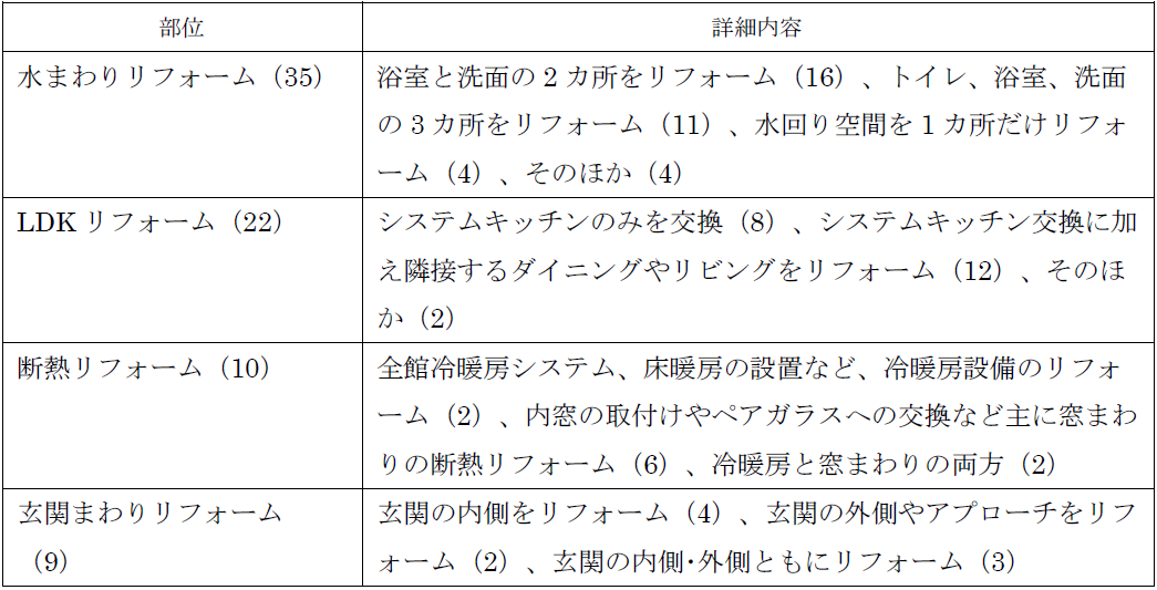 リフォーム内容は以下の内容とした。(複数部位実施を含む、カッコ内の数値は件数)
