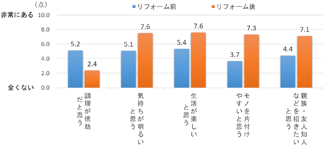 キッチンを含むLDK全体のリフォームにより気持ちも変化が見られ、「調理が億劫だと思う」が減り、「親族・友人を招きたい」「生活が楽しい」など多くの項目で良い影響が見られました。