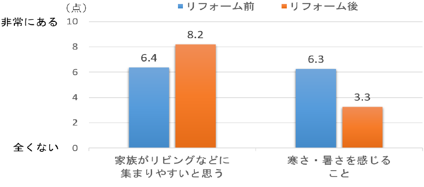 断熱リフォームでは、快適性が増したリビングに家族が集まりやすくなり、会話も増加 断熱リフォームの前後で生活状況や心身の変化があったかを10項目で質問したところ、「寒さ・暑さを感じること」が減り、「リビングなどに集まりやすいと思う」という項目で有意差が見られました(グラフ2)。居住空間の快適性が増すことで、自然と家族が集まるようになり、コミュニケーションが活発になることがわかります。また、「家族の会話が多くなった」「親族や友人・知人などを招きたいと思う」といった項目でも有意差の傾向がみられ、「話食動眠」のなかの「会話」においてよい影響をもたらすことが読み取れます。