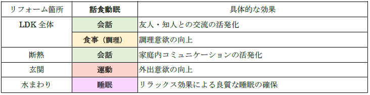 今回の調査結果から、リフォームにより「掃除がしやすい」「モノが片付けやすい」などの利便性はもちろんのこと、「生活が楽しい」「気持ちが明るくなった」「生活全般に活気がある」など気持ちが前向きになることが読み取れます。さらに、睡眠の質の向上や調理の継続、家族や知人との会話の増加、積極的な外出により運動にもつながるなど「会話」「食事(調理)」「運動」「睡眠」への良い影響も大いに期待できます。また「話食動眠」は4つの生活習慣がそれぞれに影響を及ぼしあい、生活に好循環をもたらすと考えられます。住まい全体を広範囲にリフォームすることは「話食動眠」の4つの生活習慣に幅広く好影響をもたらすことができるため、より健康な生活を長期化させることができる可能性があると考えます。