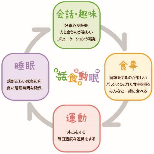 「話食動眠」とは、「生涯健康脳」を維持するために掲げているコンセプトキーワードであり、「会話」「食事(調理)」「運動」「睡眠」のことです。会話が増えると、食事が美味しくなり、活動的になり、良く眠れるようになり、一巡して更に会話が増えるといった生活の好循環を作り出すと考えています。